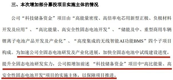 本次增加募投项目实施主体为孚能科技全资子公司广州孚能科技有限公司(简称:广州孚能)。“科技储备资金”项目中“高比能量、高安全性固态电池开发”项目实施主体由变更前仅为公司,变更为孚能科技和广州孚能。
