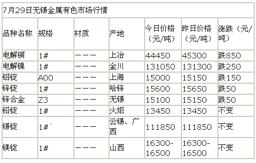 7月17日无锡金属有色市场行情(铜镍铅锌锡镁铝)