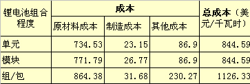 更具体来看,按照锂电池组合程度,可分为锂电池单位、锂电池模块、锂电池组/包,其原材料成本、制造成本等具体见表1。