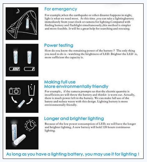 不过这只是一个概念设计,实物并没有生产出来。这款设计仅仅只是在传统的电池结构上增加LED灯泡和电线,很容易生产而且不会影响电池的使用。LED灯泡耗电量低,设计上一节新电池可以持续照明达120个小时,还是不错的。