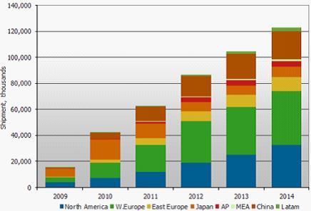 联网电视 据DisplaySearch公司统计,2010年世界电视总出货量中,具有联网功能的将近20%,达约4100万台。DisplaySearch预测,到2014年联网电视出货量将达1.23亿万台,2010~14年间的年均增长率高达30%。联网电视是继数字电视后掀起的又一波热潮,市场主要在欧美,预期2014年欧洲的市场份额将占到34%,美国占26%,尽管中国、东欧市场增长更快,但届时也不过分别占17%和9%,日本更仅占6%而已。