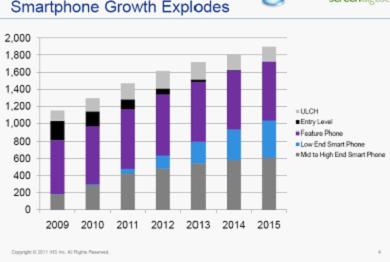 与此同时,iSuppli的数据也基本与之差不多,下图显示从2011年开始低端智手机的数量开始稳步上升。